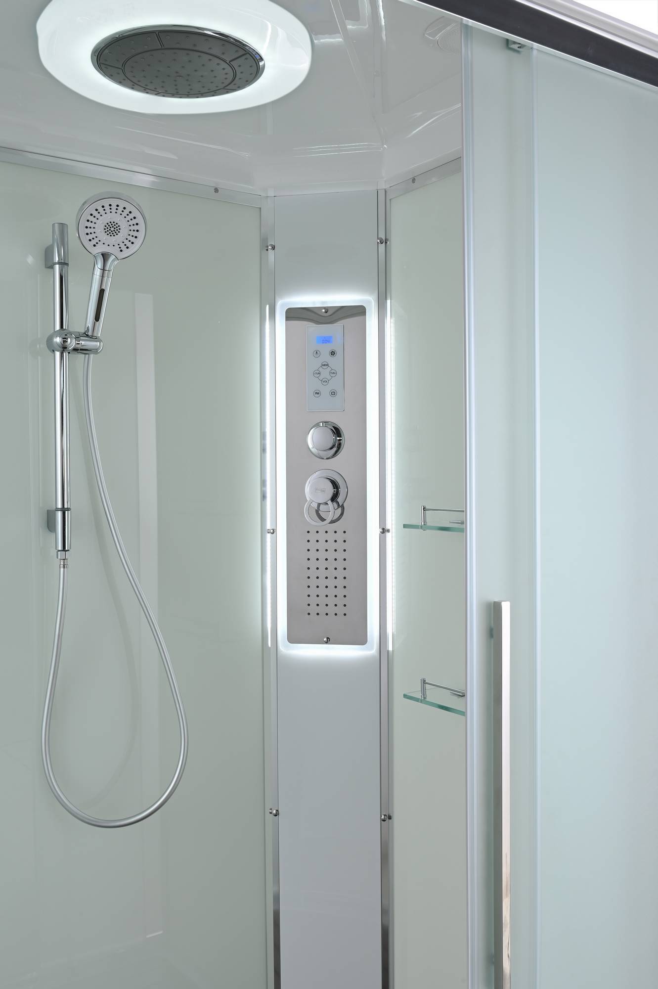 Блютуз / LED подсветка /радио /вытяжка/гидромассаж спины/сифон/ Переключатель режимов /2-е Полочки /резьбовой смеситель / Тропический (верхний) душ/ручки дверей из нержавейки /арома-лейка с витамином С/ Душевая