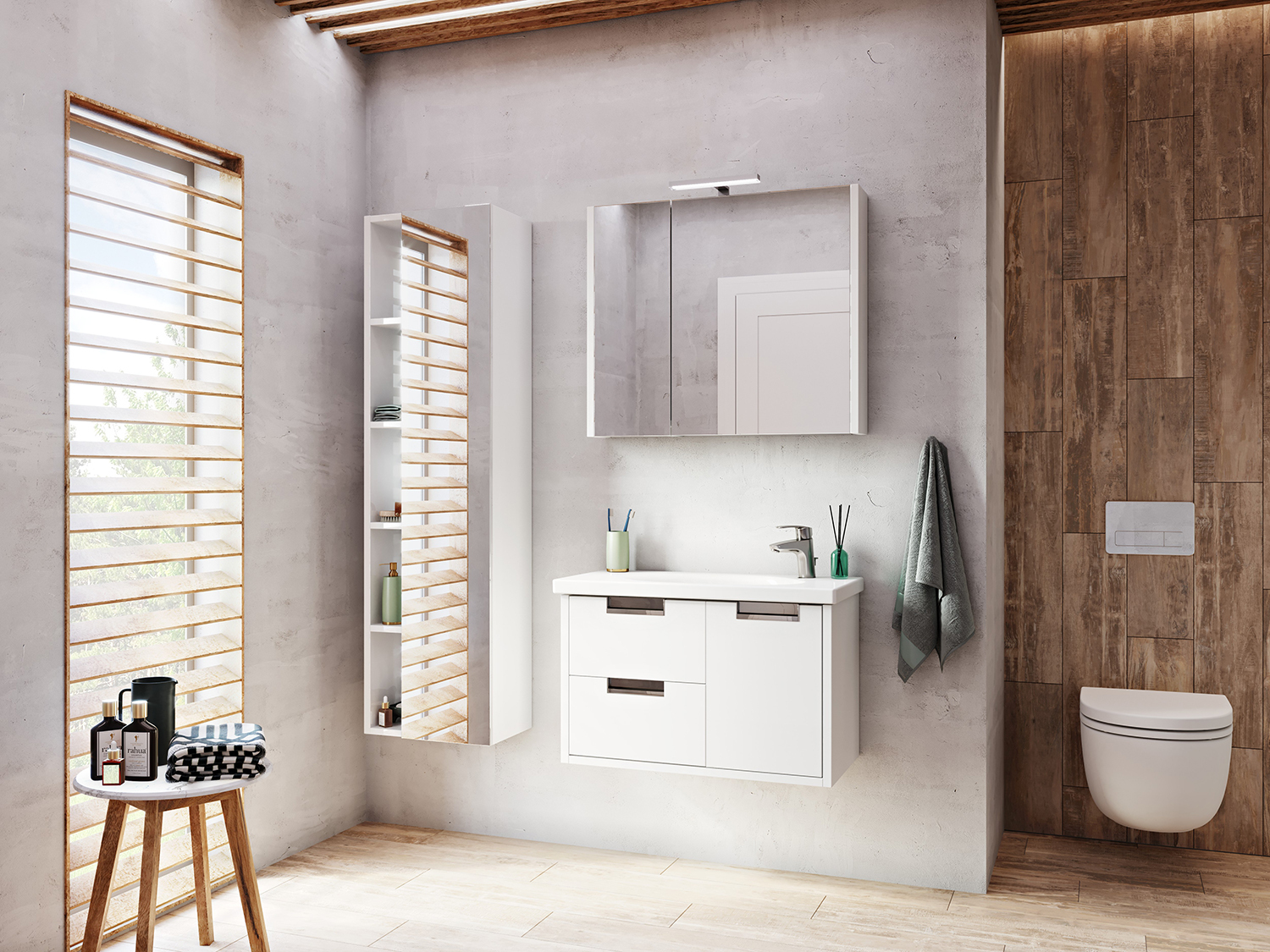 Шкаф-колонна Etna в современном стиле от испанского бренда Roca, выполненная из высококачественной влагостойкой ЛДСП и МДФ c зеркалом и открытыми полочками.