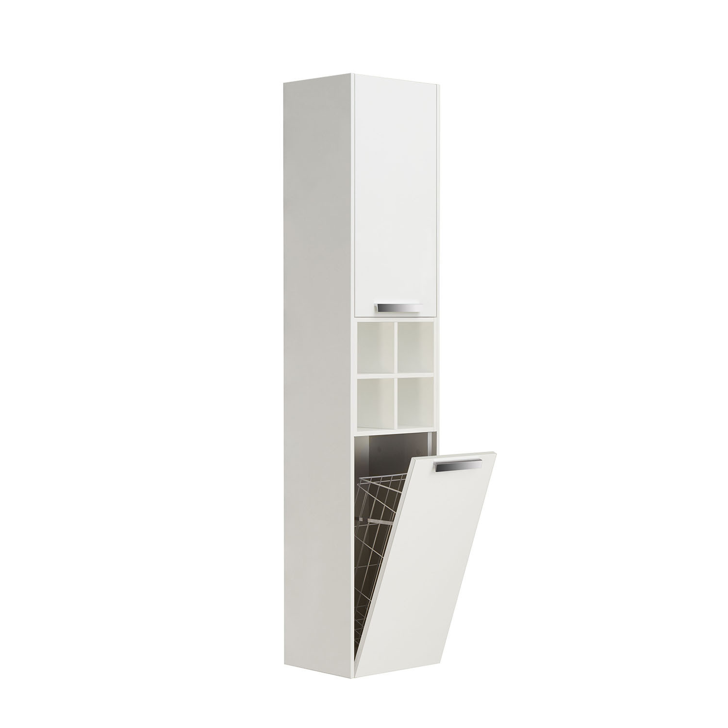 Шкаф-колонна Lago в современном стиле от испанского бренда Roca, выполненная из высококачественной влагостойкой ЛДСП в цвете светлый дуб, с бельевой корзиной.