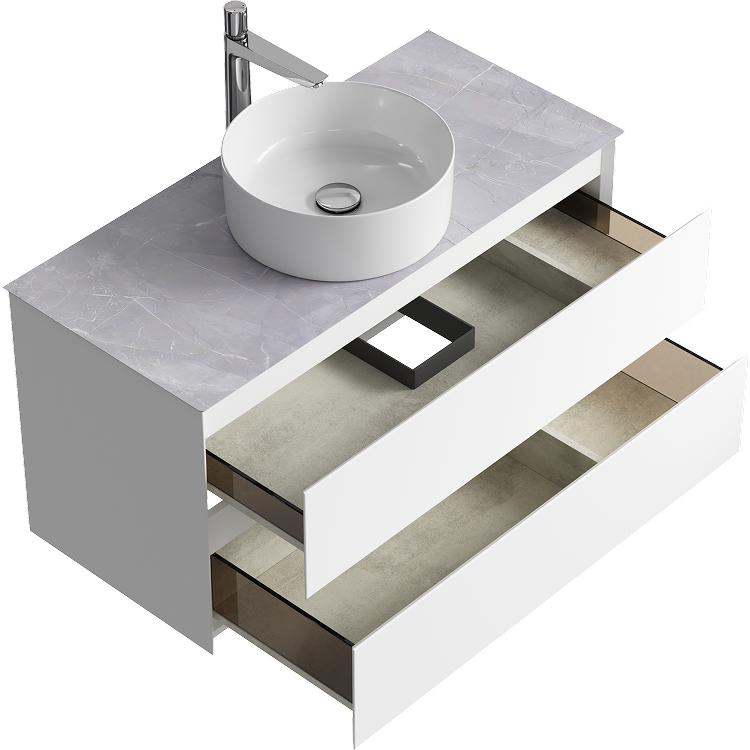 Подвесная тумба с двумя ящиком 100 см, цвет белый со столешницей серый камень и наставным умывальником