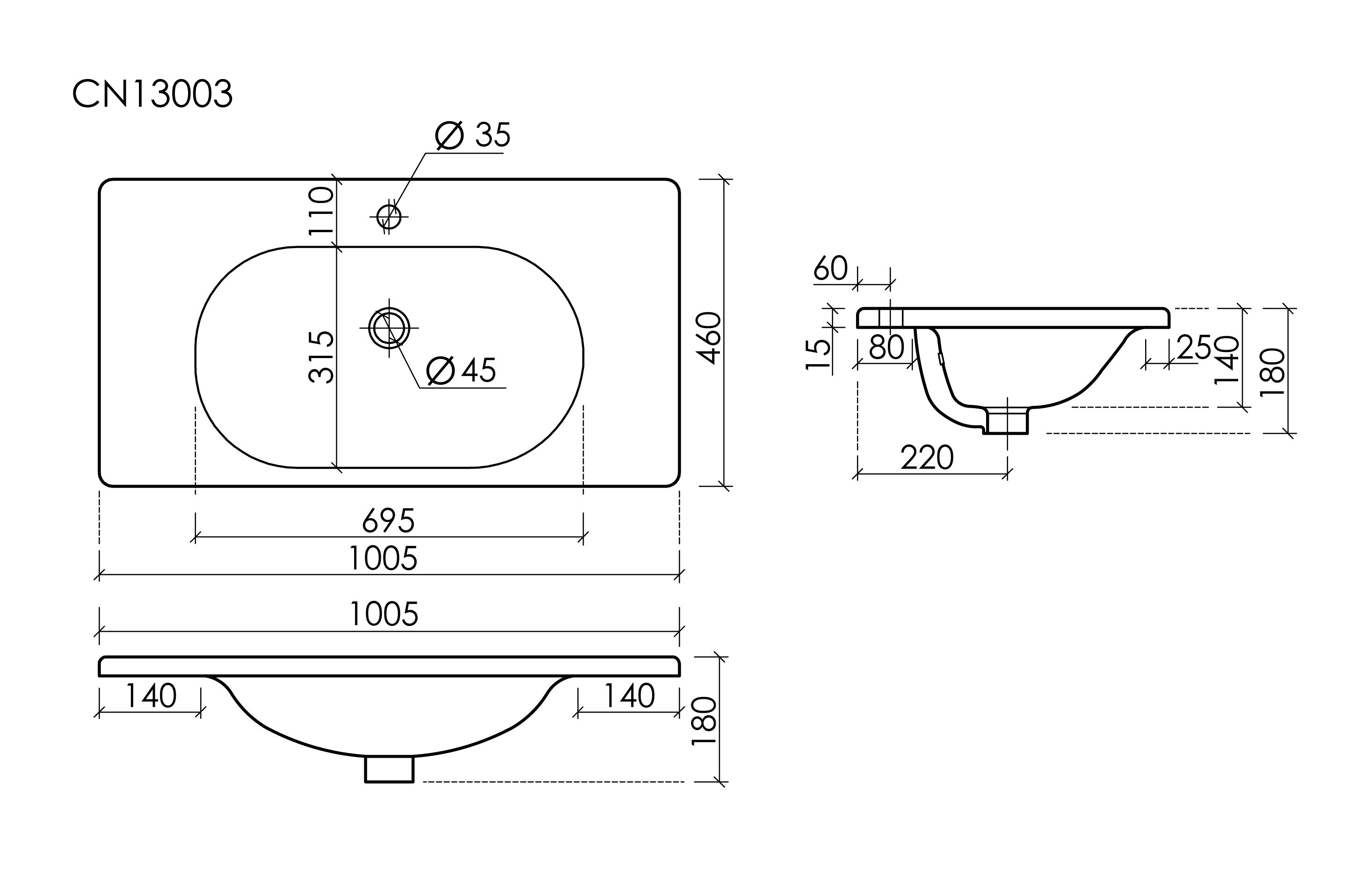 Раковина накладная Sabo, прямоугольная с отверстием под смеситель 1000x460x130, цвет белый. Для установки на мебель, арт. CN13003
