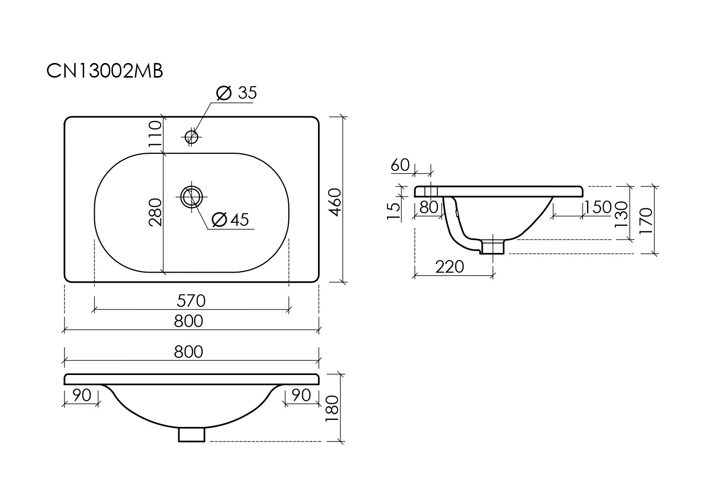 Раковина накладная Sabo, прямоугольная с отверстием под смеситель 800*460*130, цвет черный матовый. Для установки на мебель, арт. CN13002MB