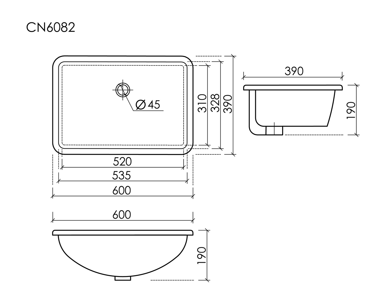 Раковина встраиваемая снизу CERAMICANOVA Era, прямоугольной формы с отверстием слива- перелива, 600x390x190 мм, с крепежом и шаблоном для установки, цвет белый, арт. CN6082