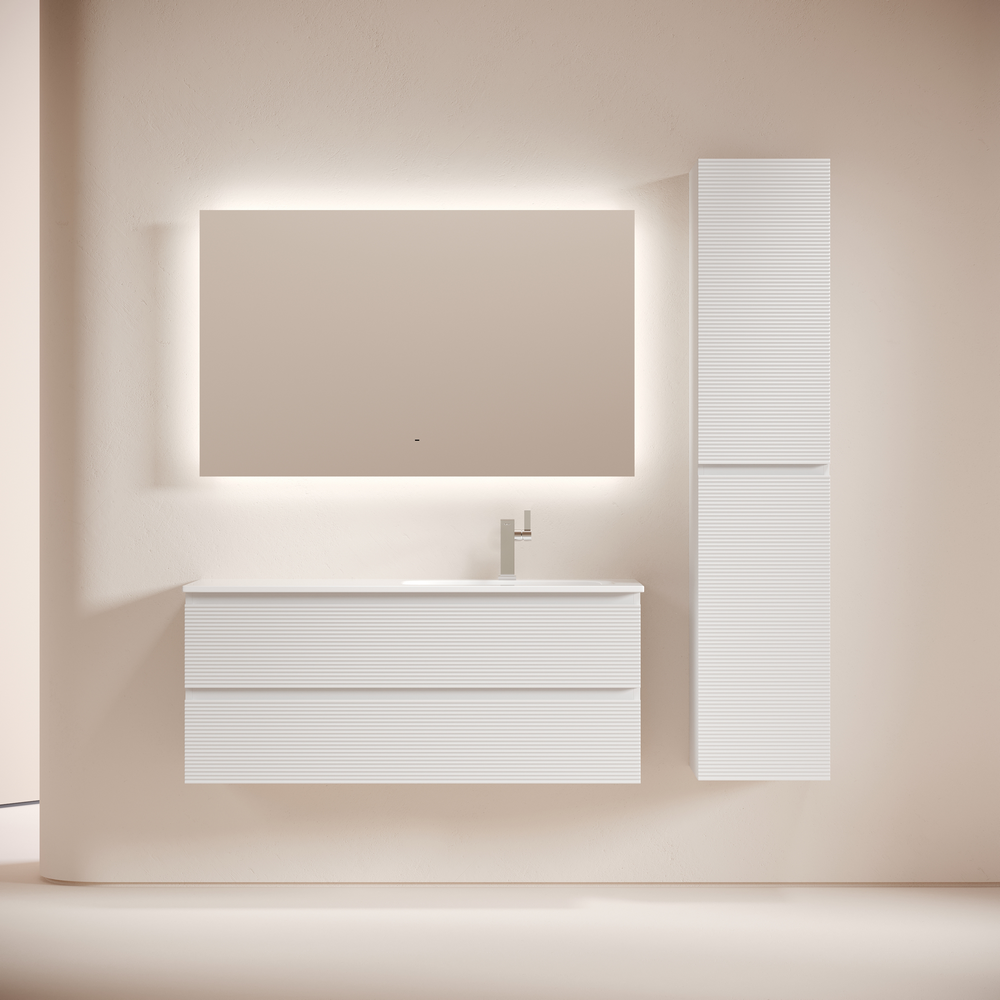 Тумба с двумя выдвижными ящиками и с доводчиками скрытого монтажа Выполнена из МДФ с покрытием ПВХ плёнка Комплектующие FIRMAX Цвет bianco На изображении мебель Snob R представлена с зеркалом SQUARE 120 (SQ120 и смесителем из коллекции LINN (SC9019CH), раковиной Grace CN7021