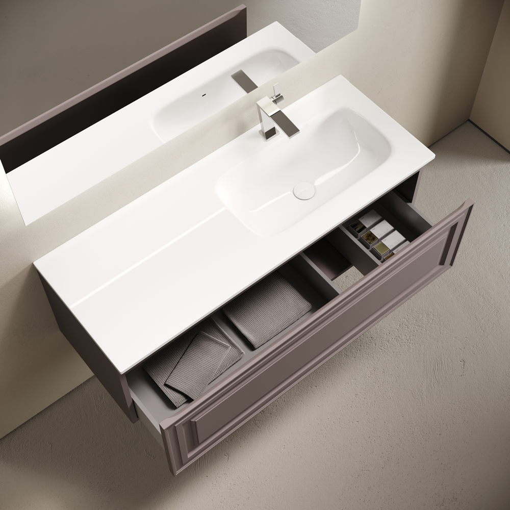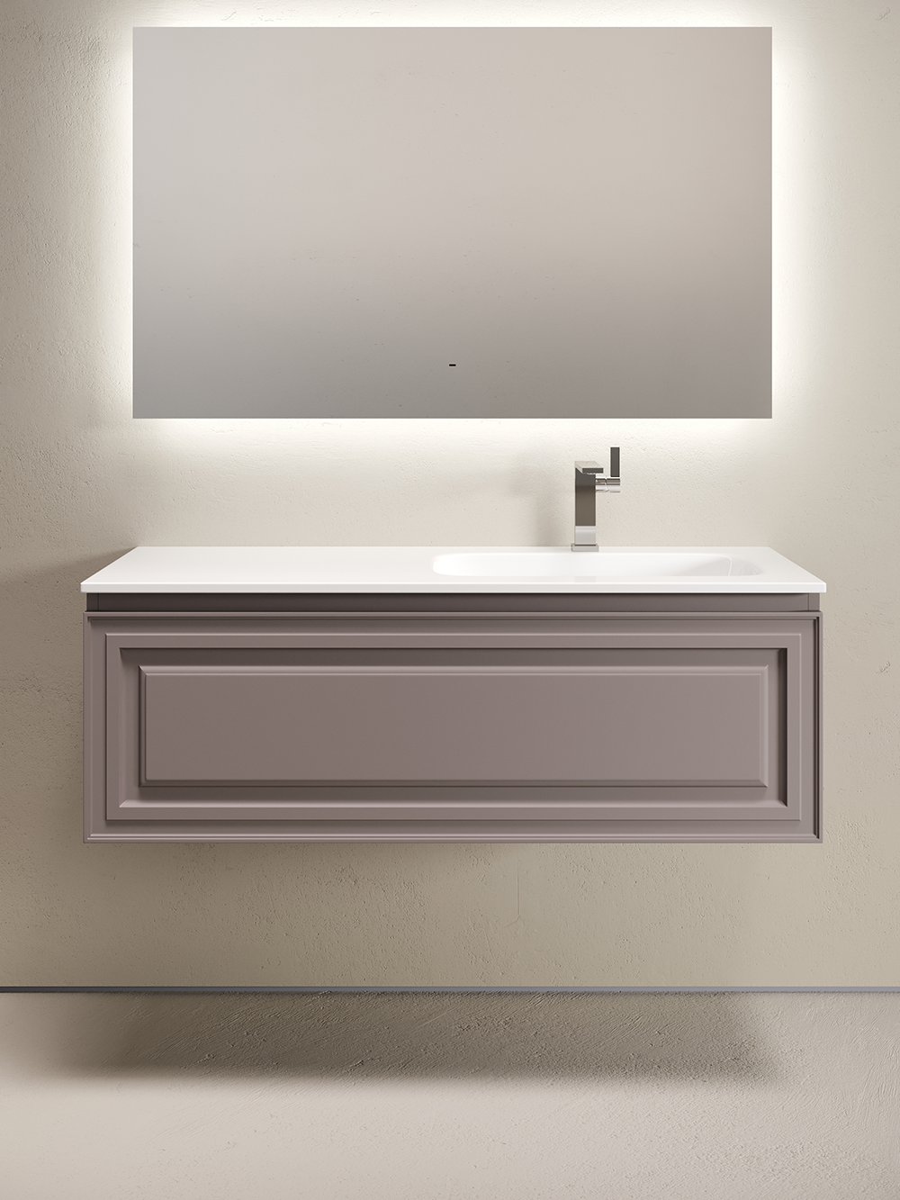 На изображении мебель Snob R представлена с зеркалом SQUARE 120 (SQ120 и смесителем из коллекции LINN (SC9019CH), раковиной Grace CN7021
