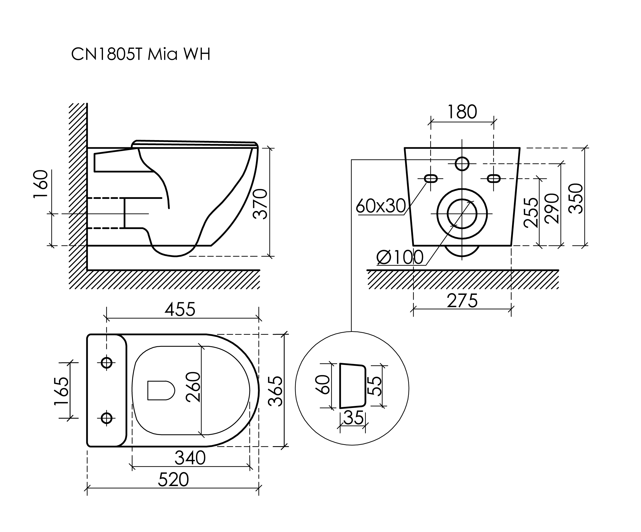 Подвесной унитаз Mia Торнадо, смыв Торнадо, с крепежом для полностью скрытого монтажа, ультратонким сидением и крышкой с функцией плавного закрытия, белый CN1805T