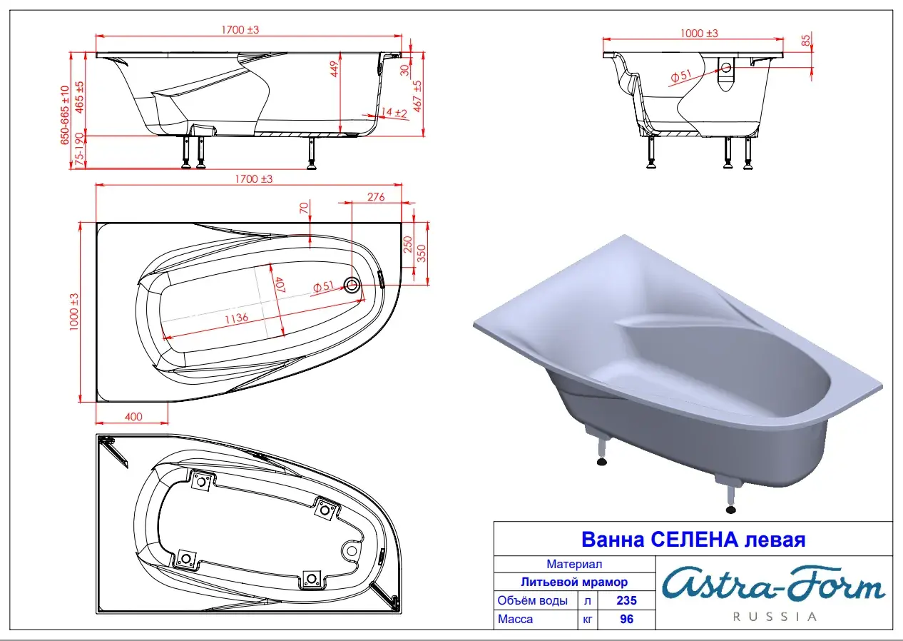 Ванна СЕЛЕНА пустая, литой мрамор, левая 1700х1000 – купить за 73 300 ₽ | ПРО100 ВАННА